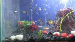 2 feet Aquarium,decorated with Volcano, lighting, black, artificial and real plants, and black gravels.
