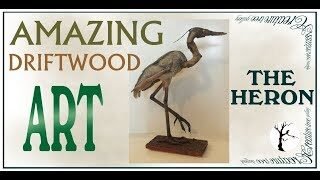 A unique handmade assemblage sculpture of a Heron bird made by artist J.P. Clough using only raw natural materials from rivers and forests in Canada