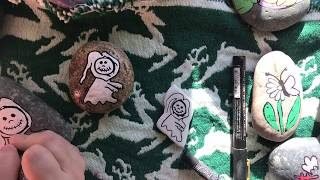 Ghost painted rock tutorial easy beginner using paint pens. Starting with a small posca black paint pen we do the outline, next is the coloring in and then the final adding any attributes or additional markings to the ghost painted rock.