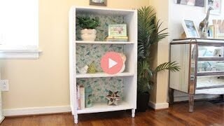 The biggest change in updating this cheap furniture was changing the color with spray paint. But before we did that, we added molding on the sides, just like a picture frame, to add a little interest to it. We also added wooden furniture feet to the bottom to add some height and additional visual appeal. While the paint dried, we used Glue Dots Mini Squares to attach a fun fabric to the existing back panel. After reattaching the back panel the bookcase was much more sophisticated, pretty, and decorative!